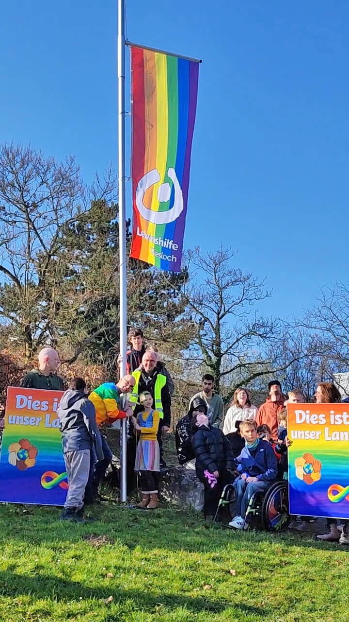 Höhepunkt der Aktionswoche war das Hissen der Regenbogenflagge von Schülersprecherin Hermine gemeinsam mit Schulleiter Michael Steinhauser im Beisein vieler Schülerinnen und Schüler. Ein klares Statement: „Wir strahlen heller als die Wahlplakate vor unserer Schule!“